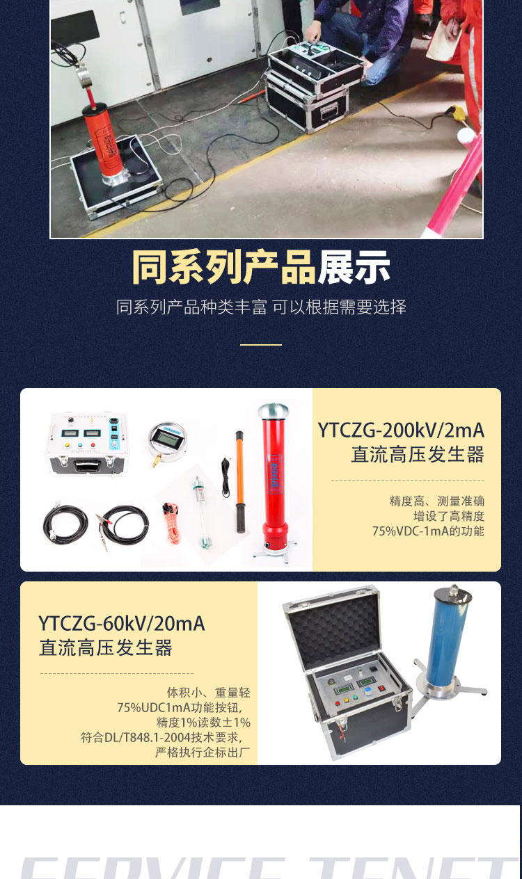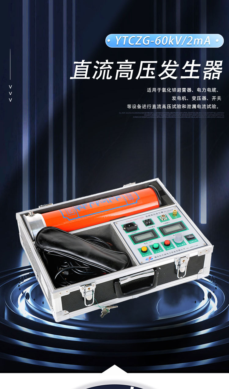 YTCZG-60kV/2mA直流高壓發(fā)生器是根據(jù)中國行業(yè)標(biāo)準(zhǔn)ZBF24003-90《便攜式直流高壓發(fā)生器通用技術(shù)條件》的要求,重新設(shè)計制造的新一 代便攜式直流高壓發(fā)生器。YTCZG-60kV/2mA直流高壓發(fā)生器適用于電力部門、企業(yè)動力部門對氧化鋅避雷器、電力電纜、發(fā)電機(jī)、變壓器、開關(guān)等設(shè) 備進(jìn)行直流高壓試驗和泄漏電流試驗。