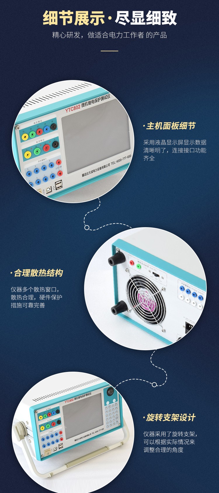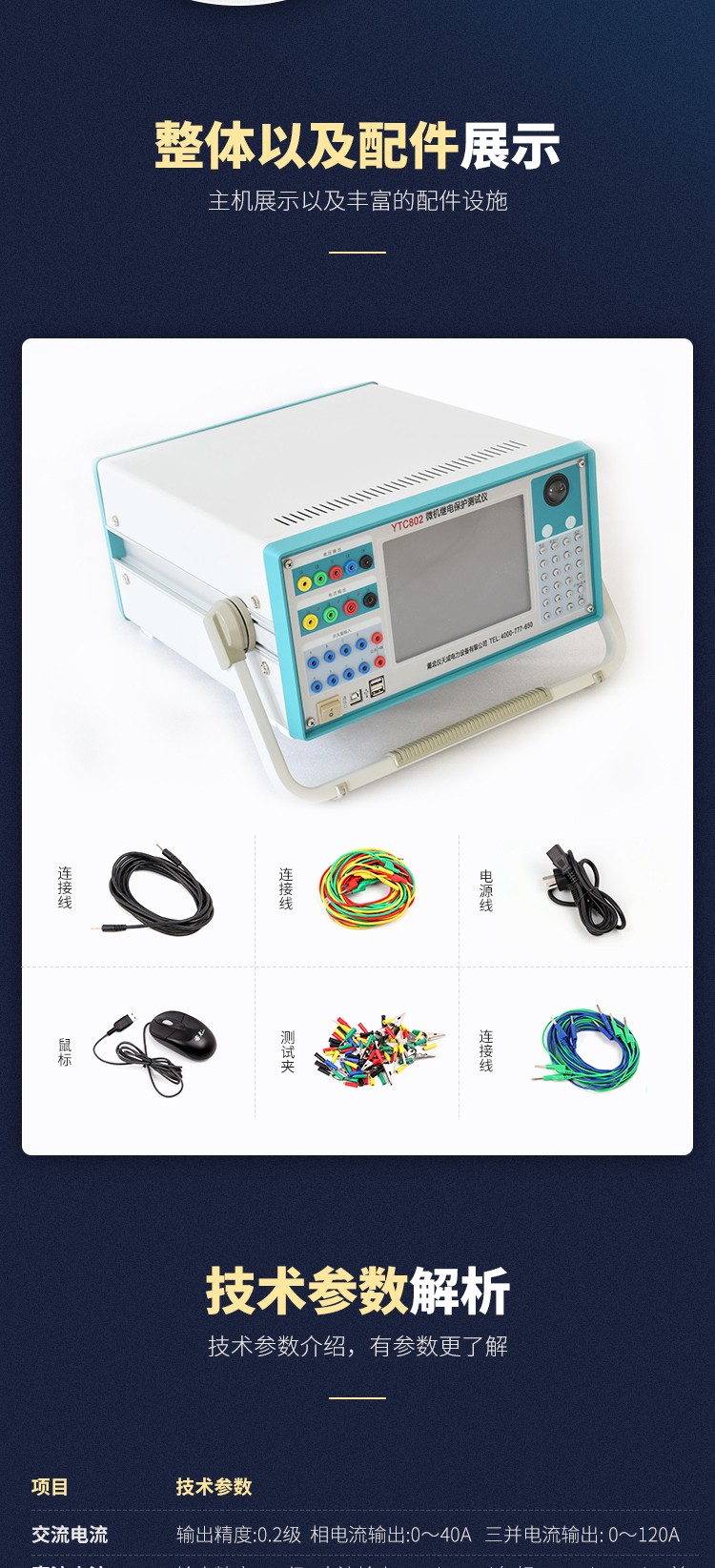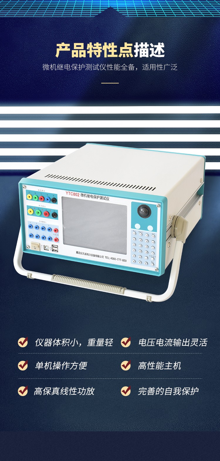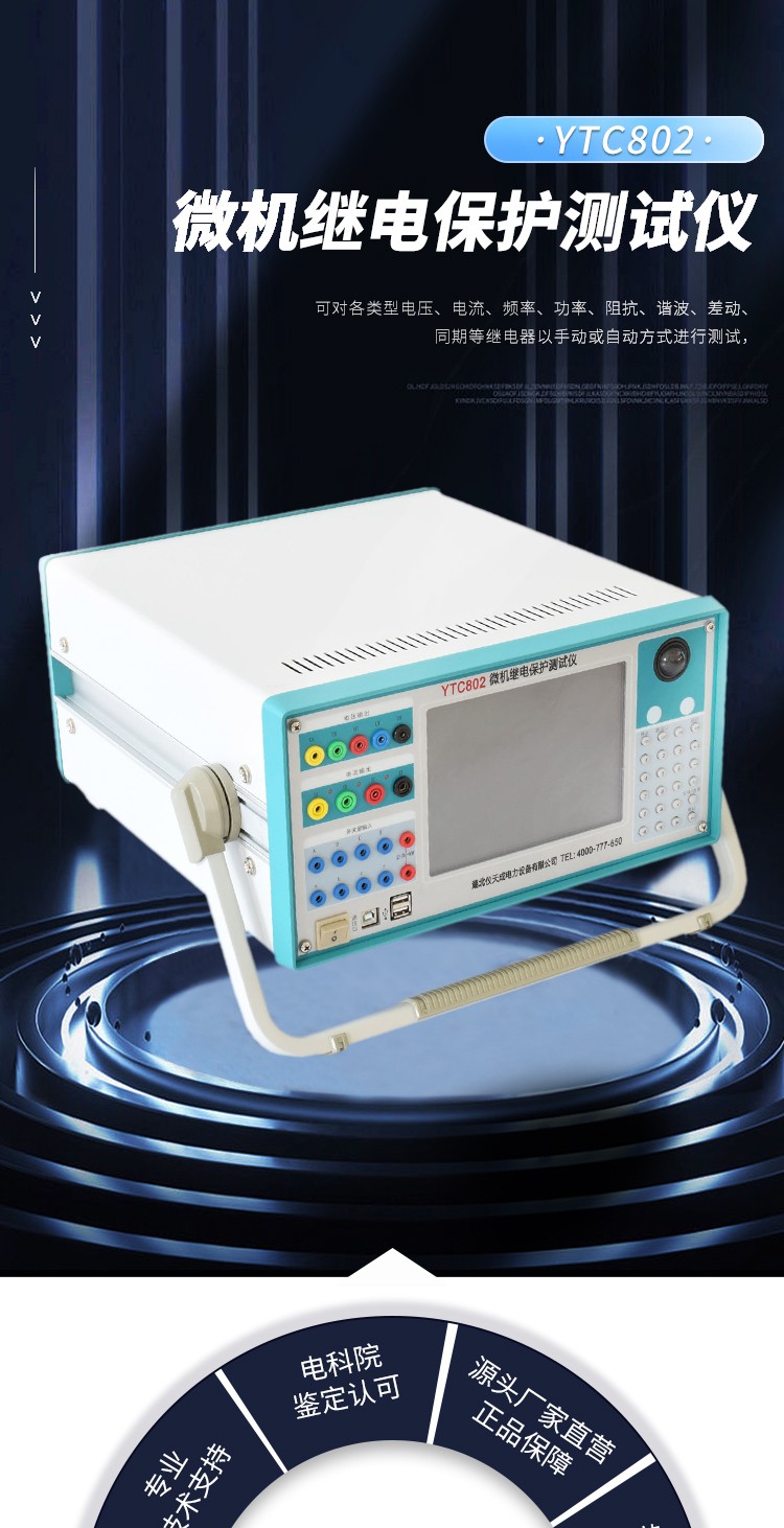 YTC802微機繼電保護測試儀,可對各類型電壓、電流、頻率、功率、阻抗、諧波、差動、同期等繼電器以手動或自動方式進行測試,可模擬各種故障類型進行距離、零序保護裝置定值校驗和保護裝置的整組試驗。