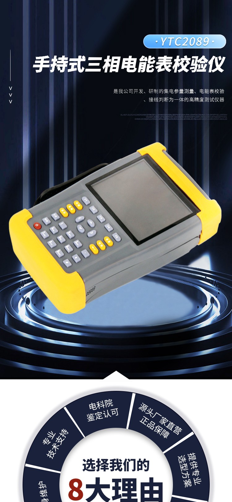 YTC2089手持式多功能電能表現(xiàn)場校驗儀是我公司開發(fā)、研制的集電參量測量、電能表校驗、接線判斷為一體的高精度測試儀器。該儀器配以高精度、高線性度的電壓互感器和電流互感器,使儀器對各種參量的測量精度很高,同時配有鉗形電流互感器,使得現(xiàn)場接線簡便,無需斷開電流回路即可直接接入。